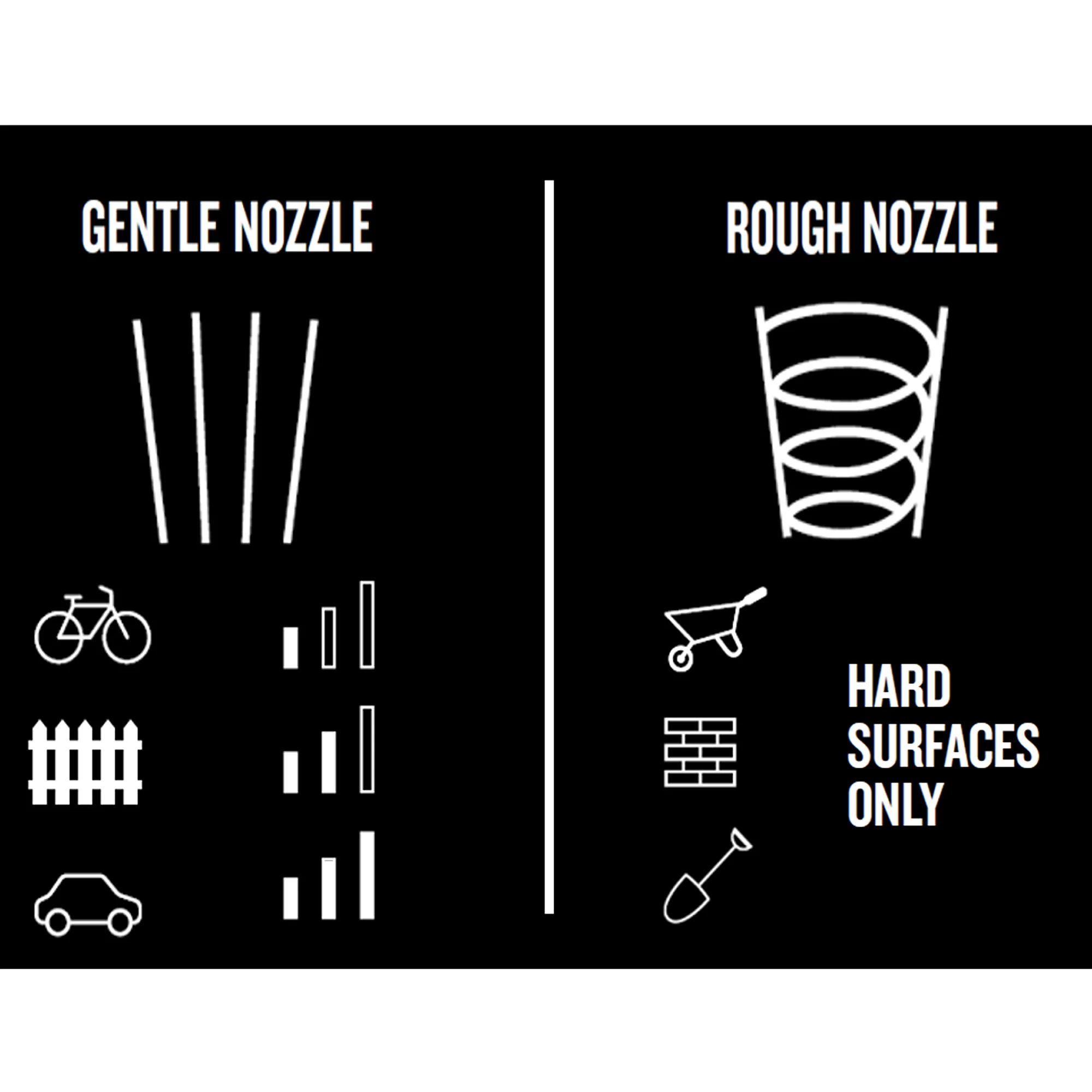 - Clean a multitude of surfaces & objects with ease – Gentle nozzle, Rough nozzle, detergent dispenser and patio cleaner included